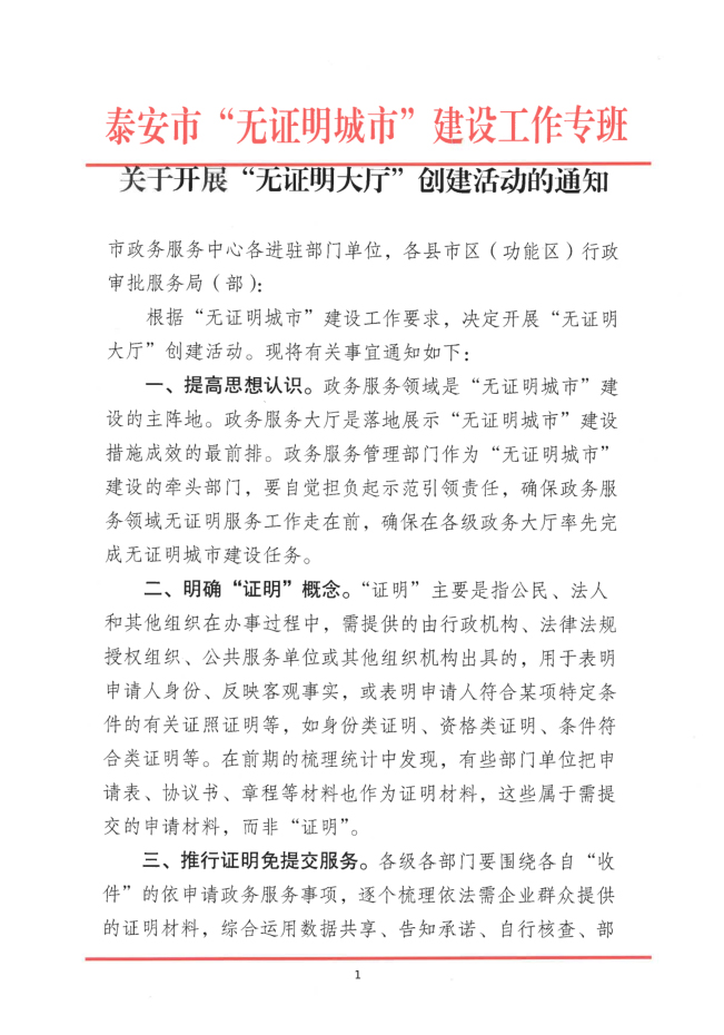 您當前位置》政策法規》泰安市“無證明城市”建設工作專班關于開展“無證明大廳”創建活動的通知